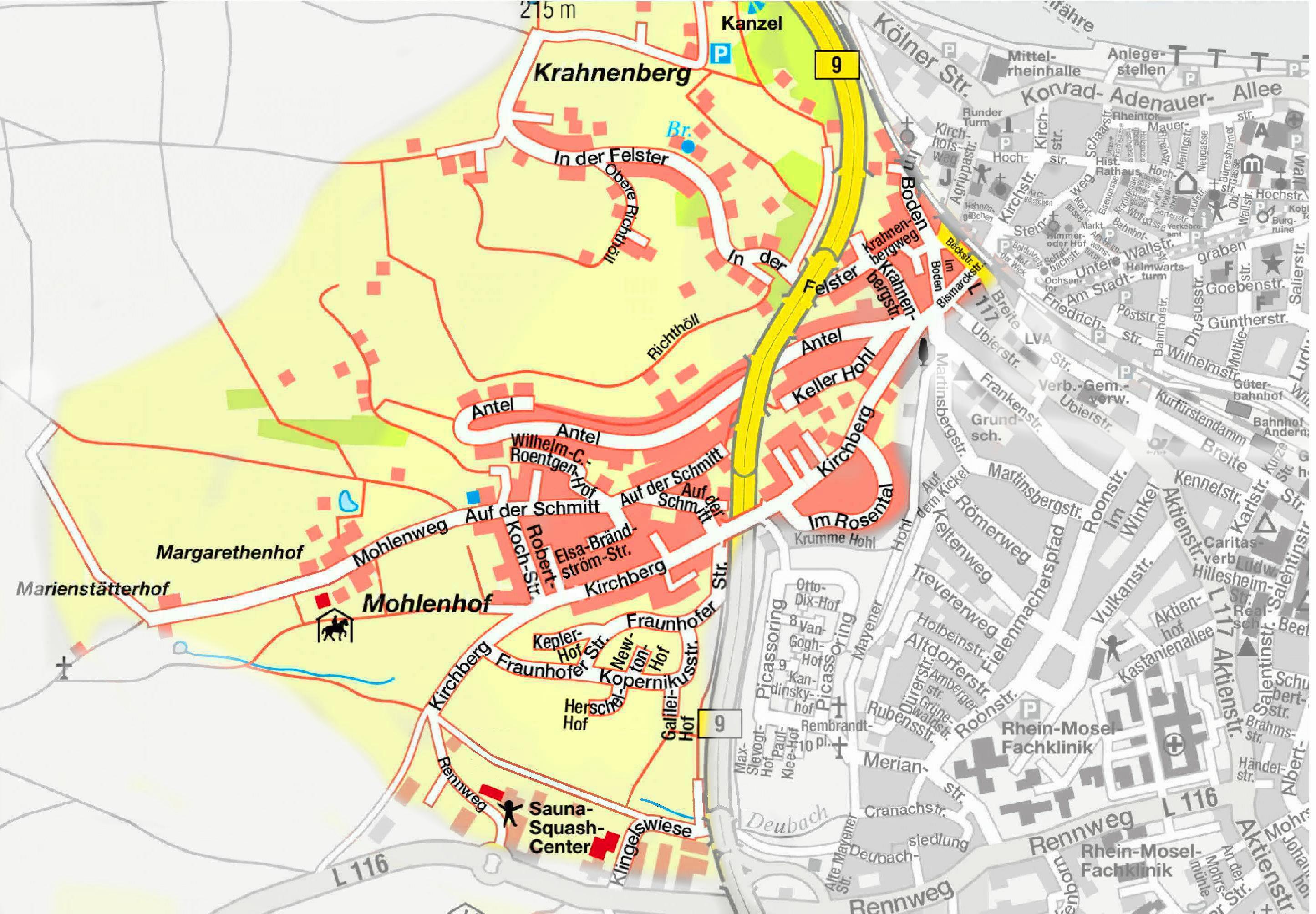 Gebiet der Oberen Kirchstraßen- Nachbarschaft erkennen (farbig unterlegt).
